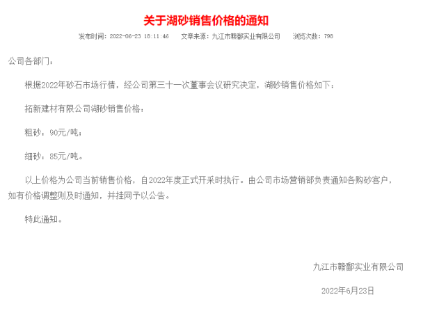 三,鄱陽湖砂:鄱陽湖砂近期銷售進展較好,自6月23日公布湖砂價格以來,采區船只密集,排號船只可達百條,下游需求恢復期間,采區價格未有變動,目前貿易商或者代理商在采區價格之上浮動約為2-4元即可上船。以下是調價通知: